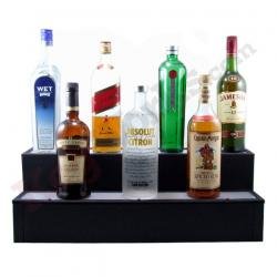 Display and organize your liquor bottles in style with this illuminated bottle shelf. Shelves are made of black, vinyl-clad metal with clear, acrylic step covers. Step covers remove easily to access light bulbs inside each step. Easy on/off switch and 6-foot electrical cord make this bottle shelf easy to maintain. Heavy-duty construction for years of use. These bottle shelves are custom made. Sorry, NO RETURNS on this item. So, be sure to measure carefully. Features: No assembly required - ships ready to use. Light up bottle for an nice translucent look. Specs: Overall Dimensions: 8" H x 8" Deep. Individual shelf measurements: 4" H x 4" Deep. Lengths available from 24" - 108" (select below). 120v, single phase, 60Hz, Less than 5 full load amps. Shipping: Units 42" and under are shipped via UPS Ground. Units longer than 42" are shipped via freight truck. Please allow 2-3 weeks for delivery. Includes: Includes fluorescent light bulb.