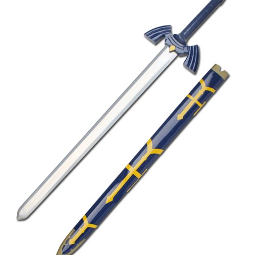Link's Great Fairy Sword Legend of Zelda with Plaque. The blade of the sword has been constructed from 440 Stainless Steel. The blade comes unsharpened. The guard of the sword is solid blue polycarbonate with a thick quillon, winged arms, and trademark yellow diamond.